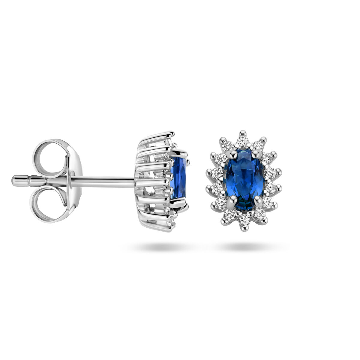 Gerhodineerd 925 zilveren oorknoppen uitgevoerd met synthetisch saffier en zirkonia. De oorknoppen hebben een afmeting van 8.5x6.5mm.