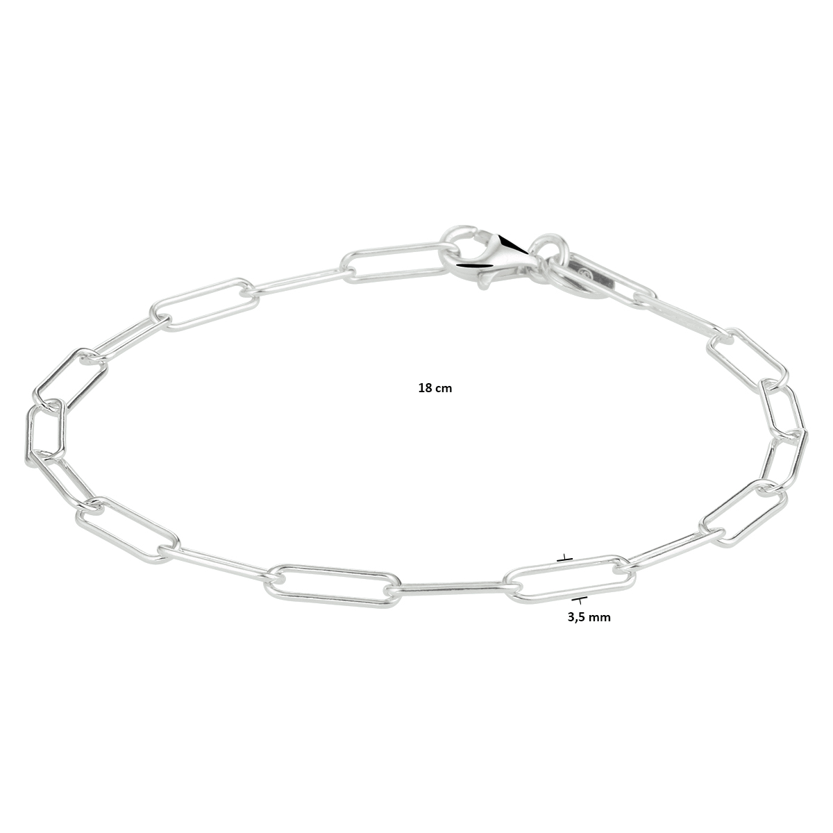 Gerhodineerd 925 zilveren paperclip armband met een schakelbreedte van 3.5mm. De armband heeft een draaglengte van 18cm en een stevige karabijn sluiting.