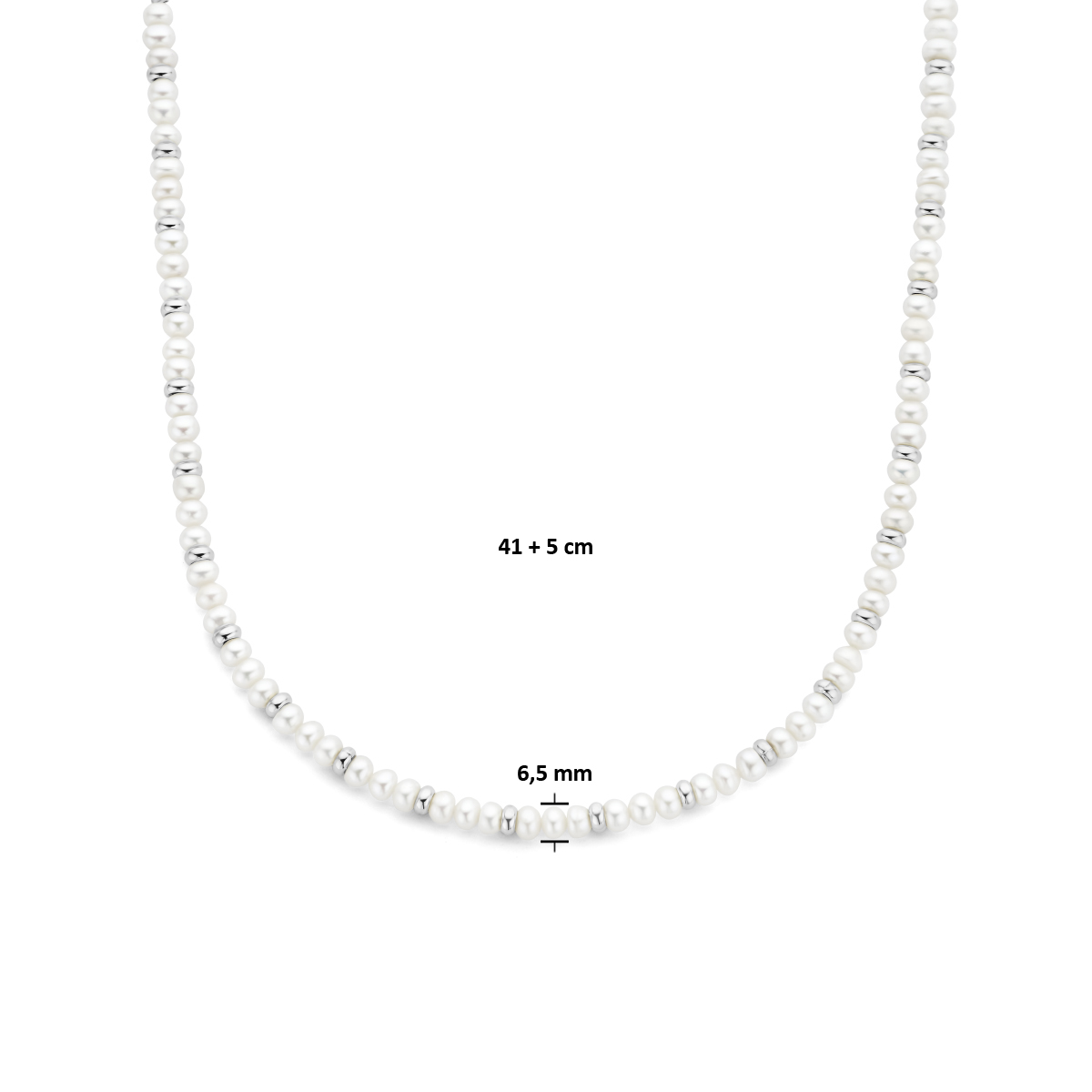 Gerhodineerd 925 collier uitgevoerd met schitterende zoetwaterparels. Het collier heeft een draaglengte van 41cm met 5cm extensie en is uitgevoerd met een karabijnsluiting.