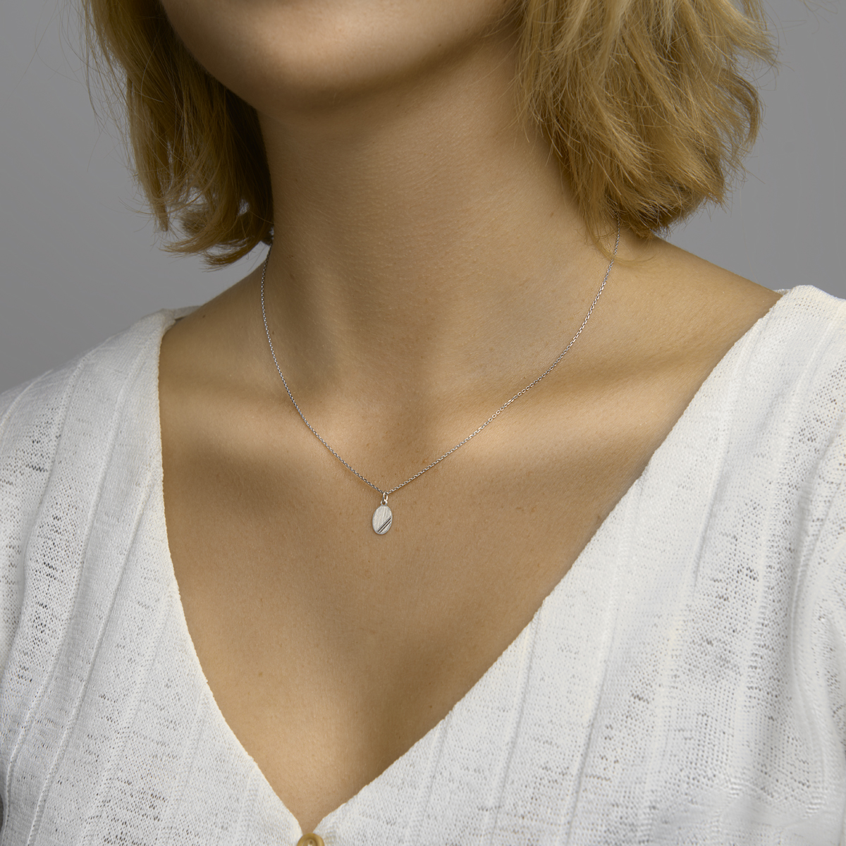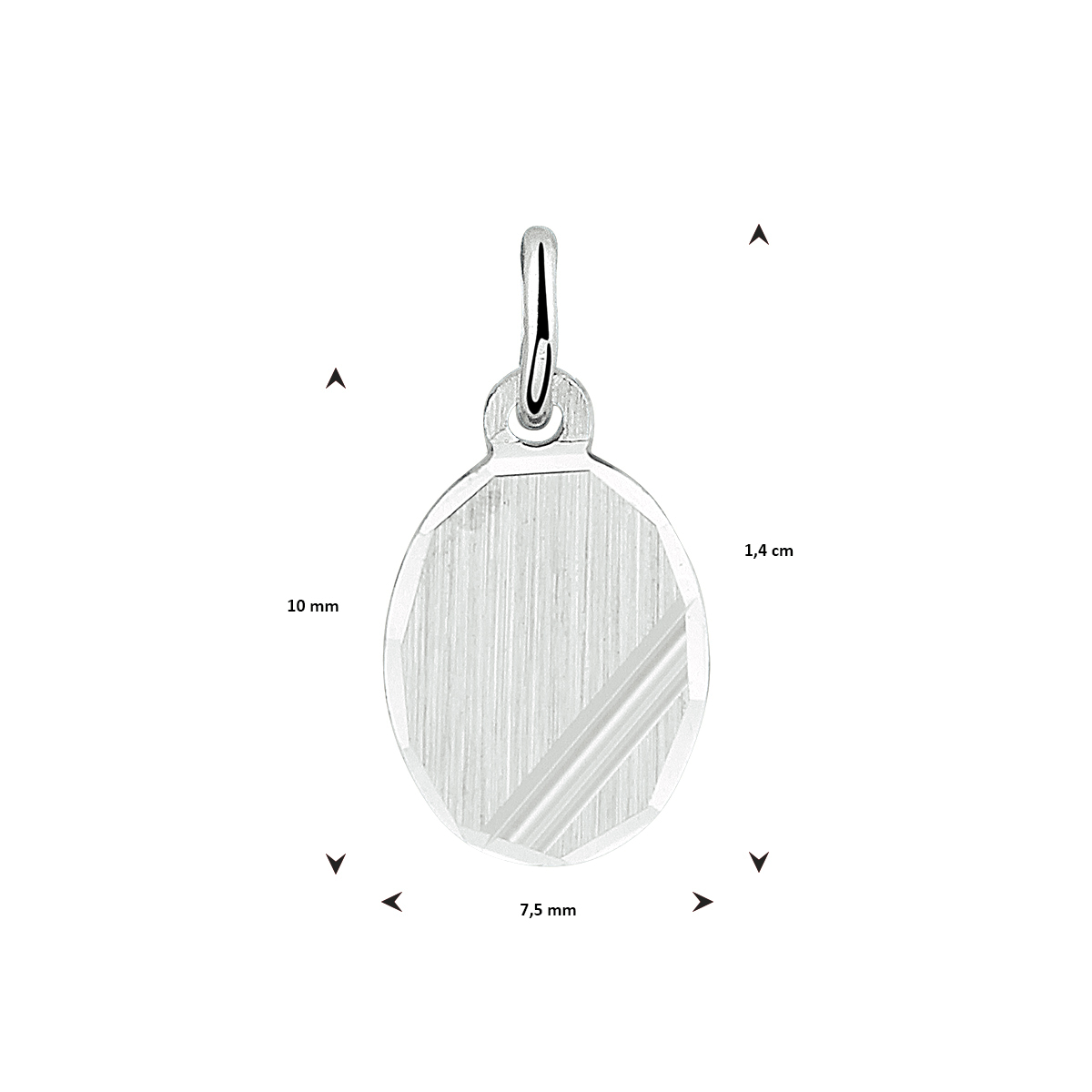 Gerhodineerd 925 zilveren ovale graveerhanger met een mat/gediamanteerde afwerking. De hanger heeft een totale hoogte van 1.4cm en een breedte van 7.5mm.