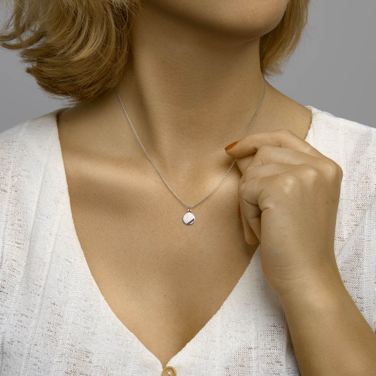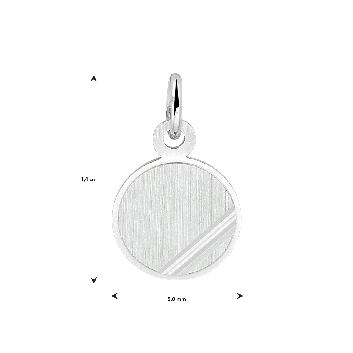 Gerhodineerd 925 zilveren ronde graveerhanger met een mat/gediamanteerde afwerking. De hanger heeft een totale hoogte van 1.4cm en een diameter van 9mm.