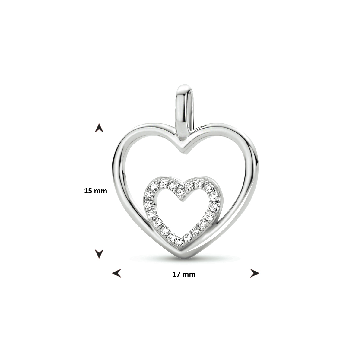 Gerhodineerd 925 zilveren hanger uitgevoerd met een hartje en een schitterende zirkonia rij. De hanger heeft een totale hoogte van 1.9cm en een breedte van 17mm.