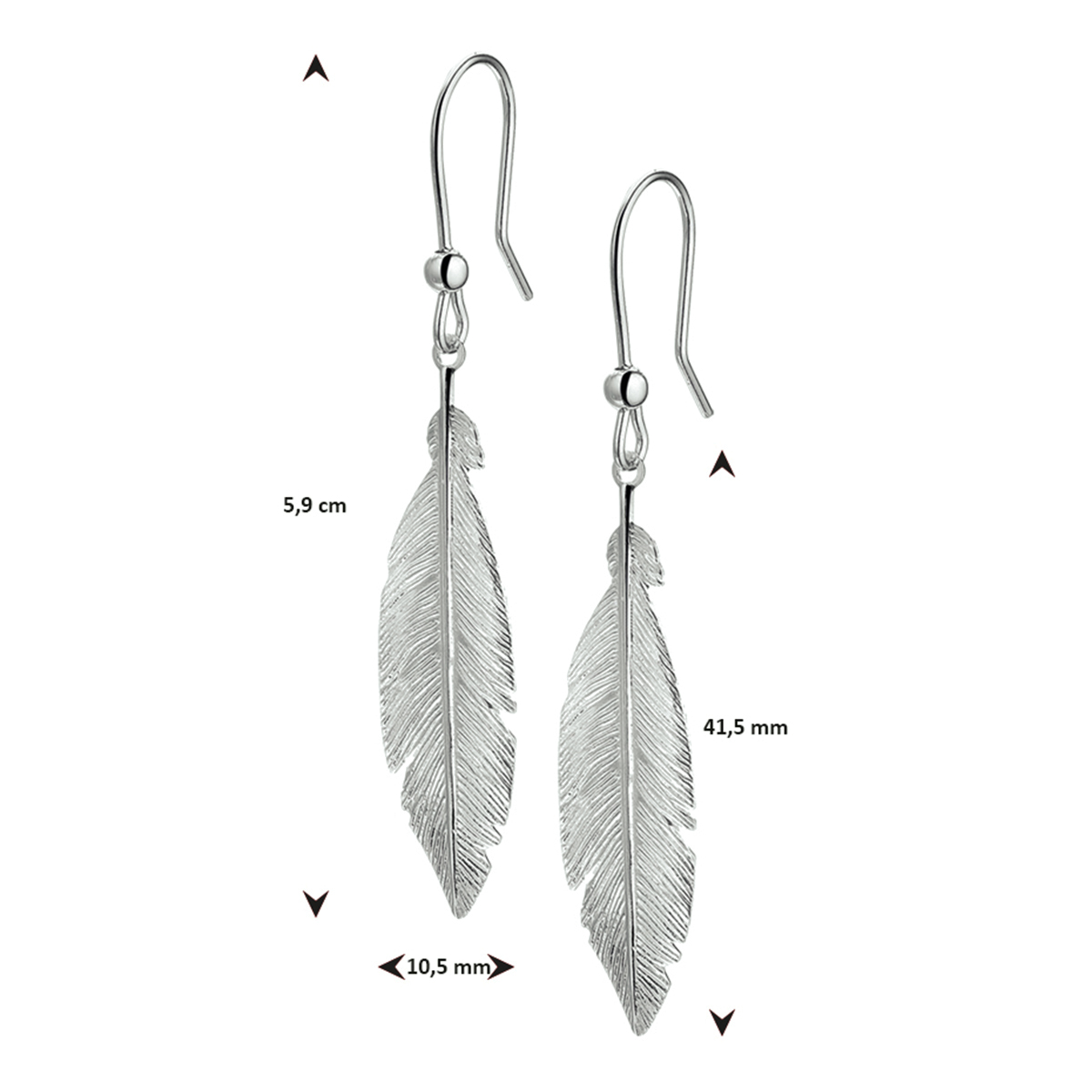 Gerhodineerd 925 zilveren oorhangers met veren. De oorhangers hebben een totale hoogte van 5.9cm. De veren hebben een afmeting van 41.5x10.5mm.