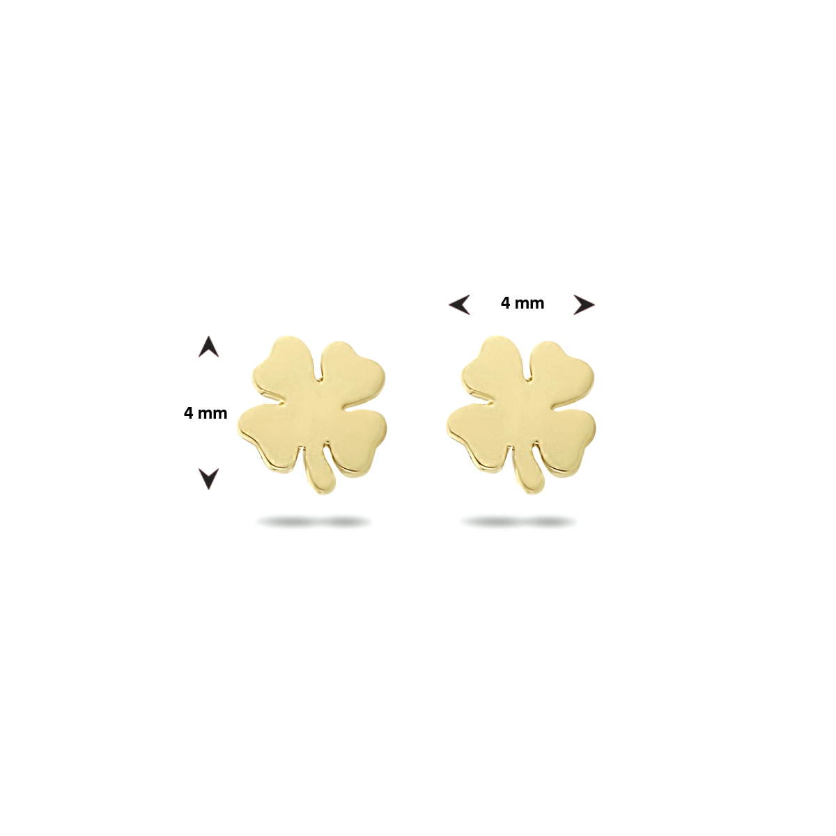 14k Geelgouden oorknoppen in de vorm van een klavertje. De oorknoppen hebben een afmeting van 4x4mm.