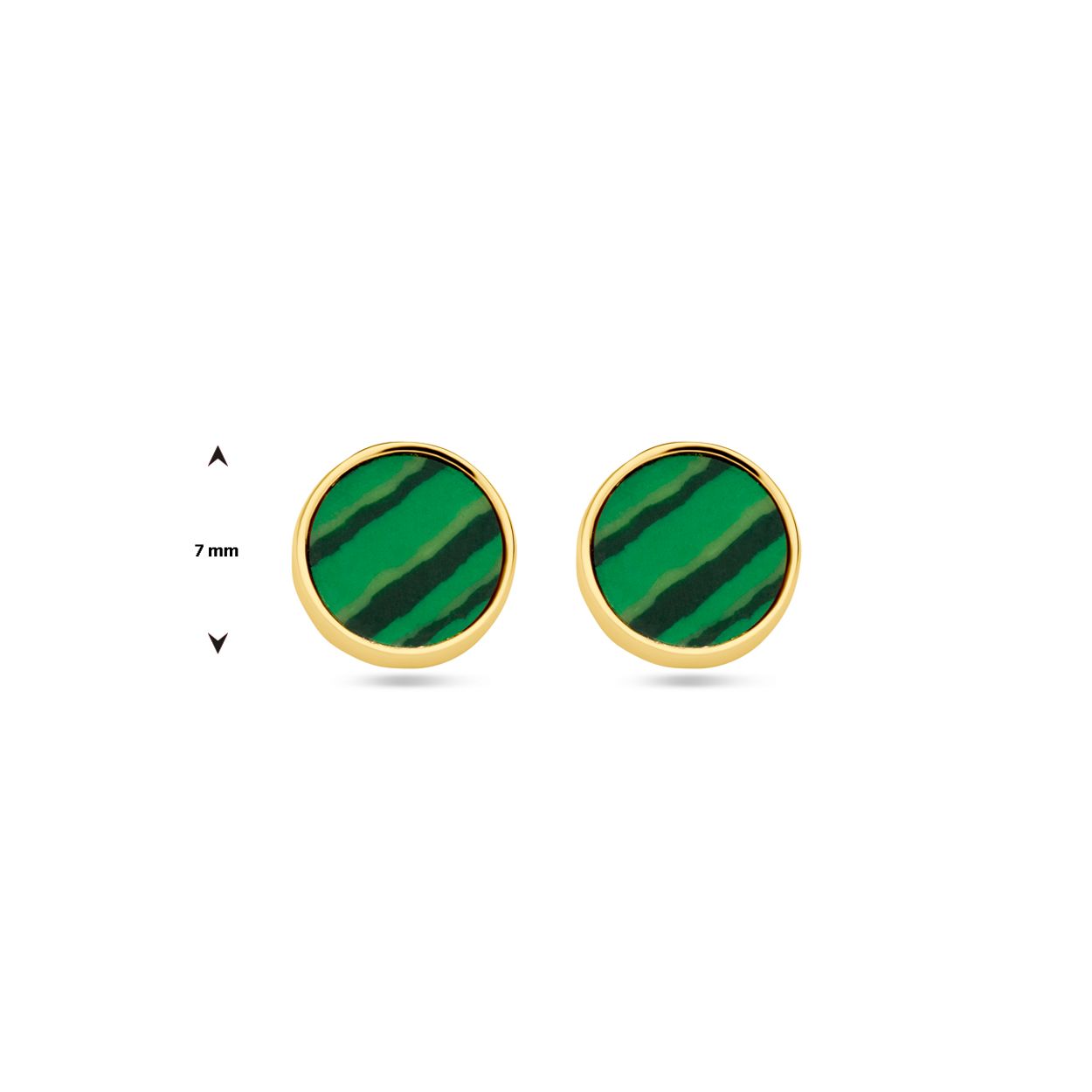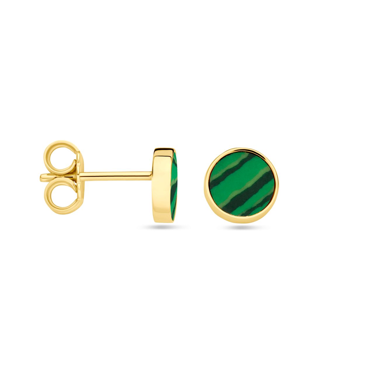 14k Geelgouden ronde oorknoppen uitgevoerd met malachiet. De oorknoppen hebben een diameter van 7 mm.