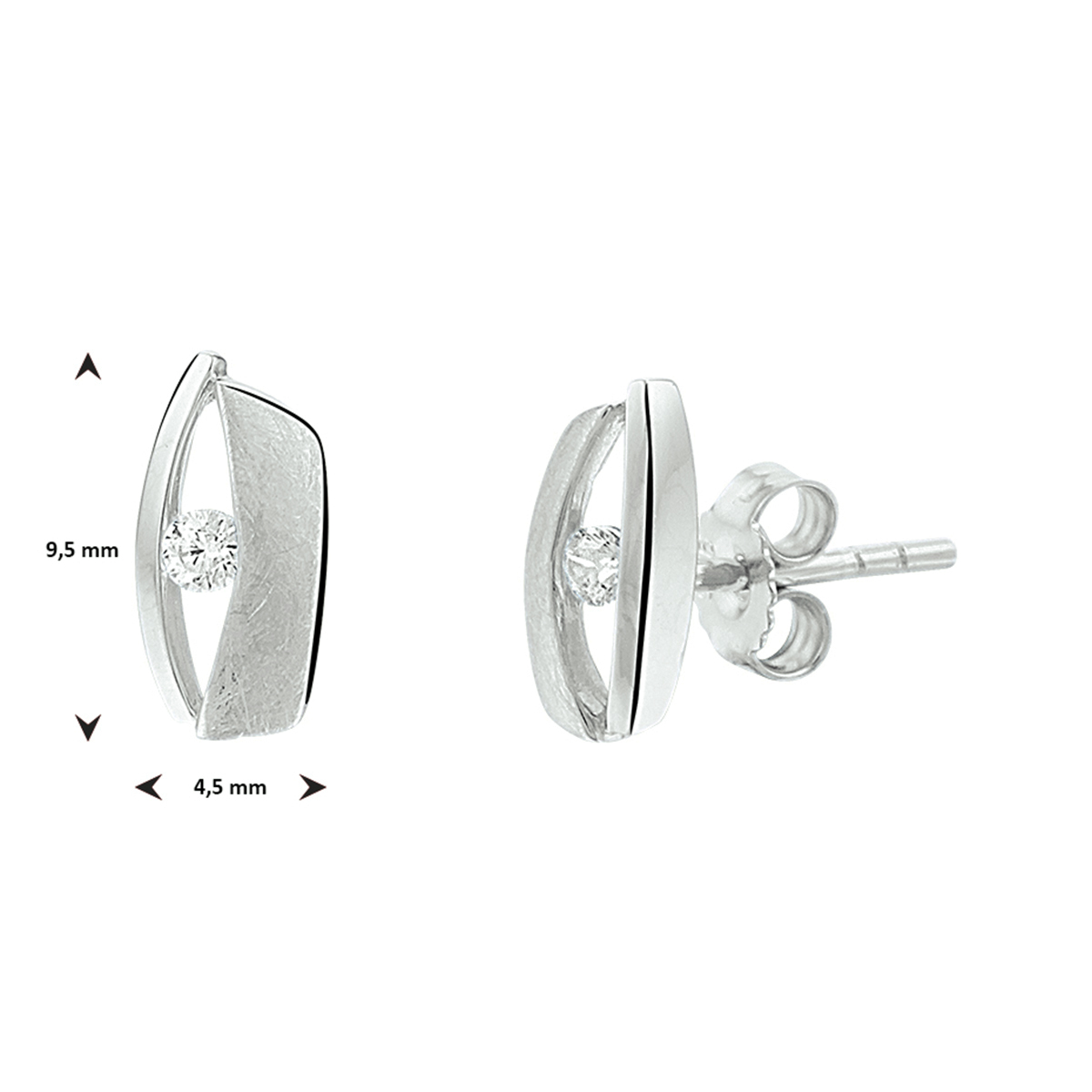 Gerhodineerd 925 zilveren oorknoppen uitgevoerd met een heldere zirkonia en een poli/matte afwerking. De oorknoppen hebben een afmeting van 9.5x4.5mm.