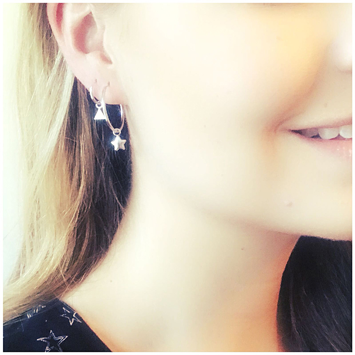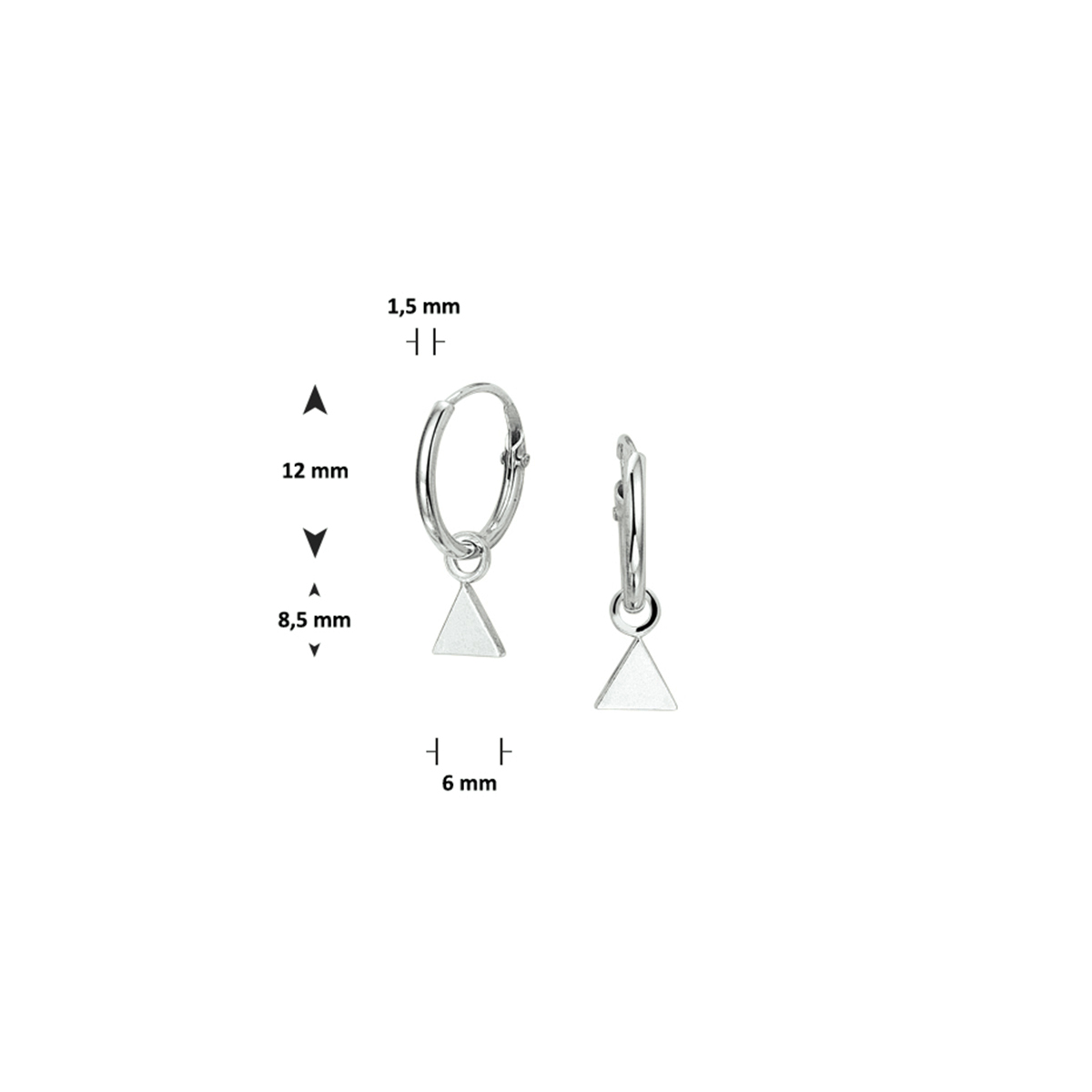Gerhodineerd zilveren oorringen met een afmeting van 12x1.5mm uitgevoerd met een driehoek van 8.5x6mm. De oorringen zijn ook verkrijgbaar in diameters 23.5mm en 33mm en in varianten met een hart ster of maan.