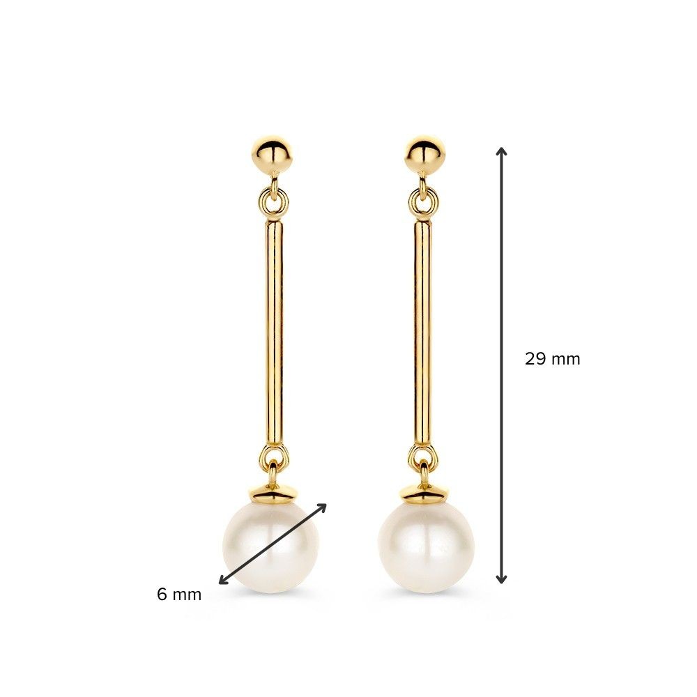 Geelgouden oorbellen met lange staafjes en een parel.