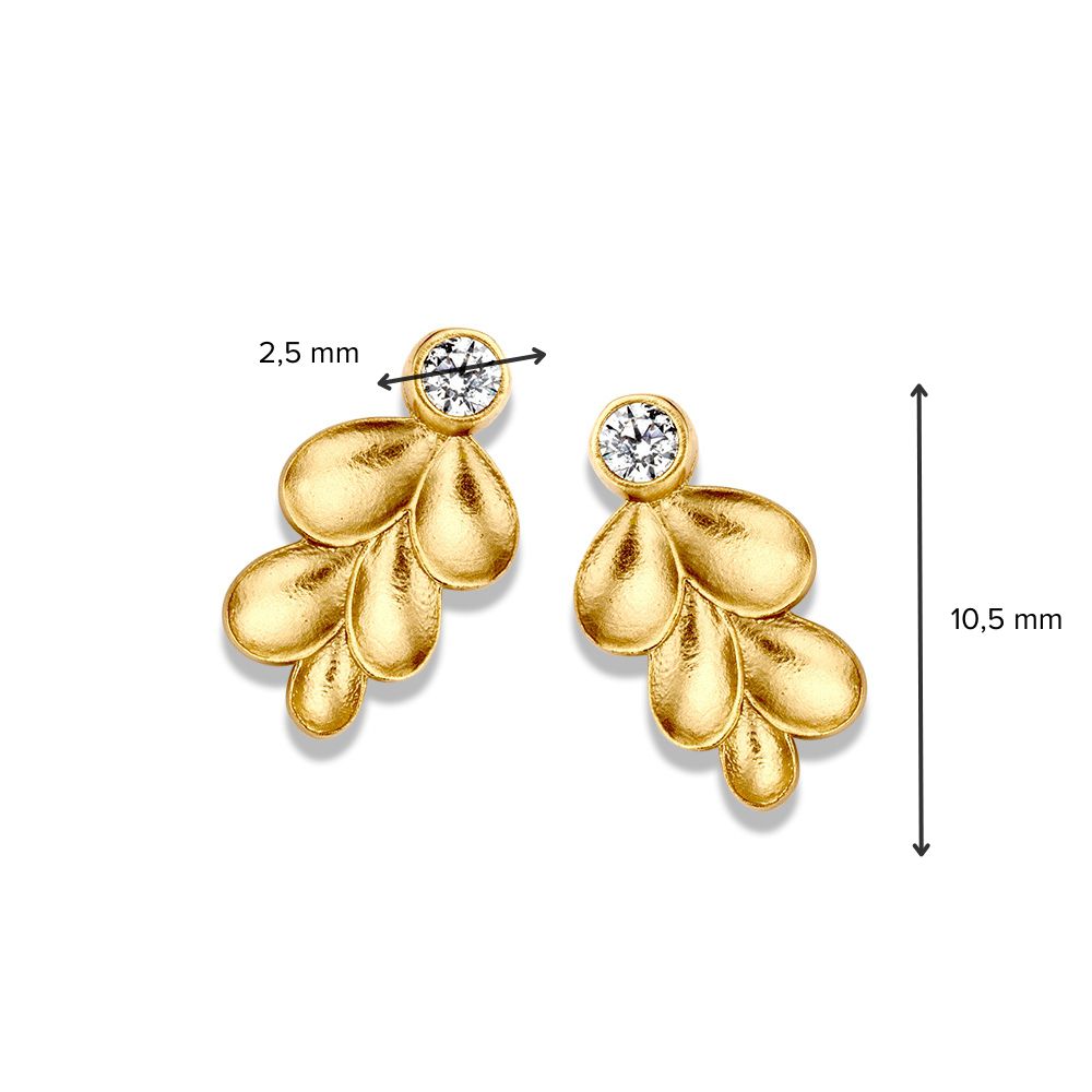 Geelgouden oorstekers in met zirkonias in de vorm van blaadjes. Deze oorstekers worden geleverd met 14 karaat�poussettes.