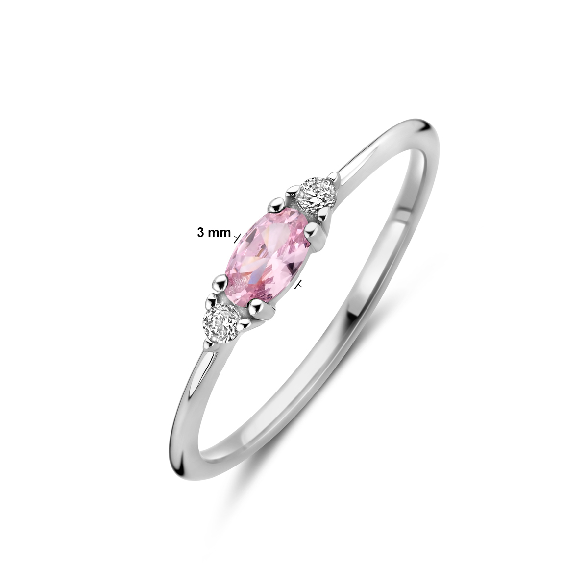 Gerhodineerd 925 zilveren ring uitgevoerd met wit en roze zirkonia. De ring heeft een breedte van 3mm.