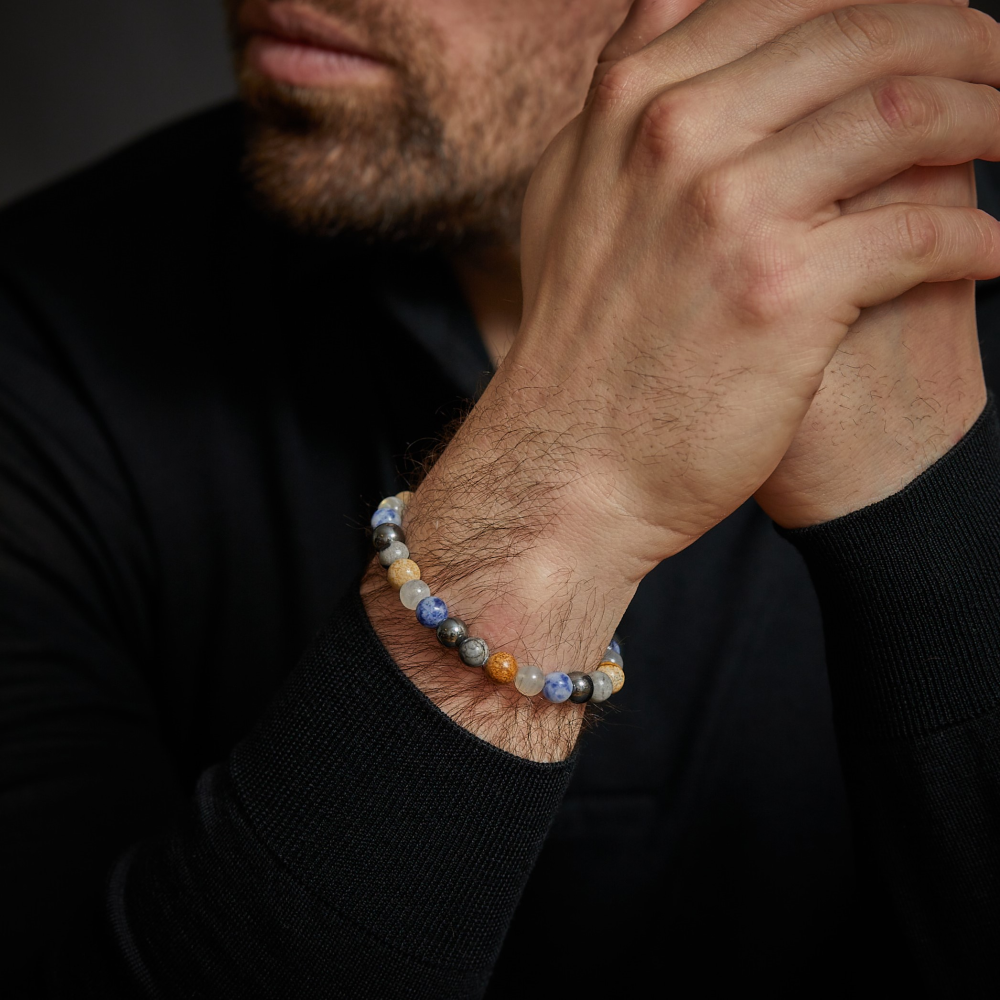Armband van het merk Rebel & Rose. De armband heeft een hoogwaardige elastische stretch koord, met 8mm van Labradorite, Lithographic, Black Network, Hematite Grey, Blue Spot Stone.