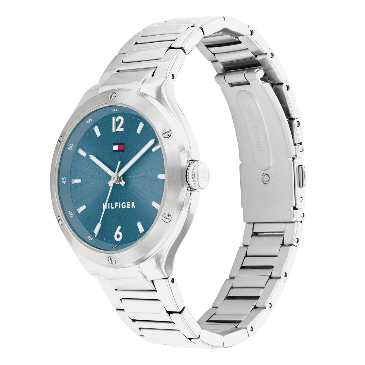 Dit unieke horloge van Tommy Hilfiger met artikelnr: TH1782475 is een casual horloge. Het stalen dameshorloge heeft een ronde zilverkleurige kast met een gladde bezel met schroefjes. Op de blauwe wijzerplaat zijn lumibrite streepjes en cijfers als uurs-aanduiding. Het horloge heeft een zilverkleurige stalen schakelband met vouwsluiting een mineraalglas een doorsnee van 38mm en is 5 ATM.  Het horloge heeft een sportief chique uitstraling voor de echte Tommy klant.