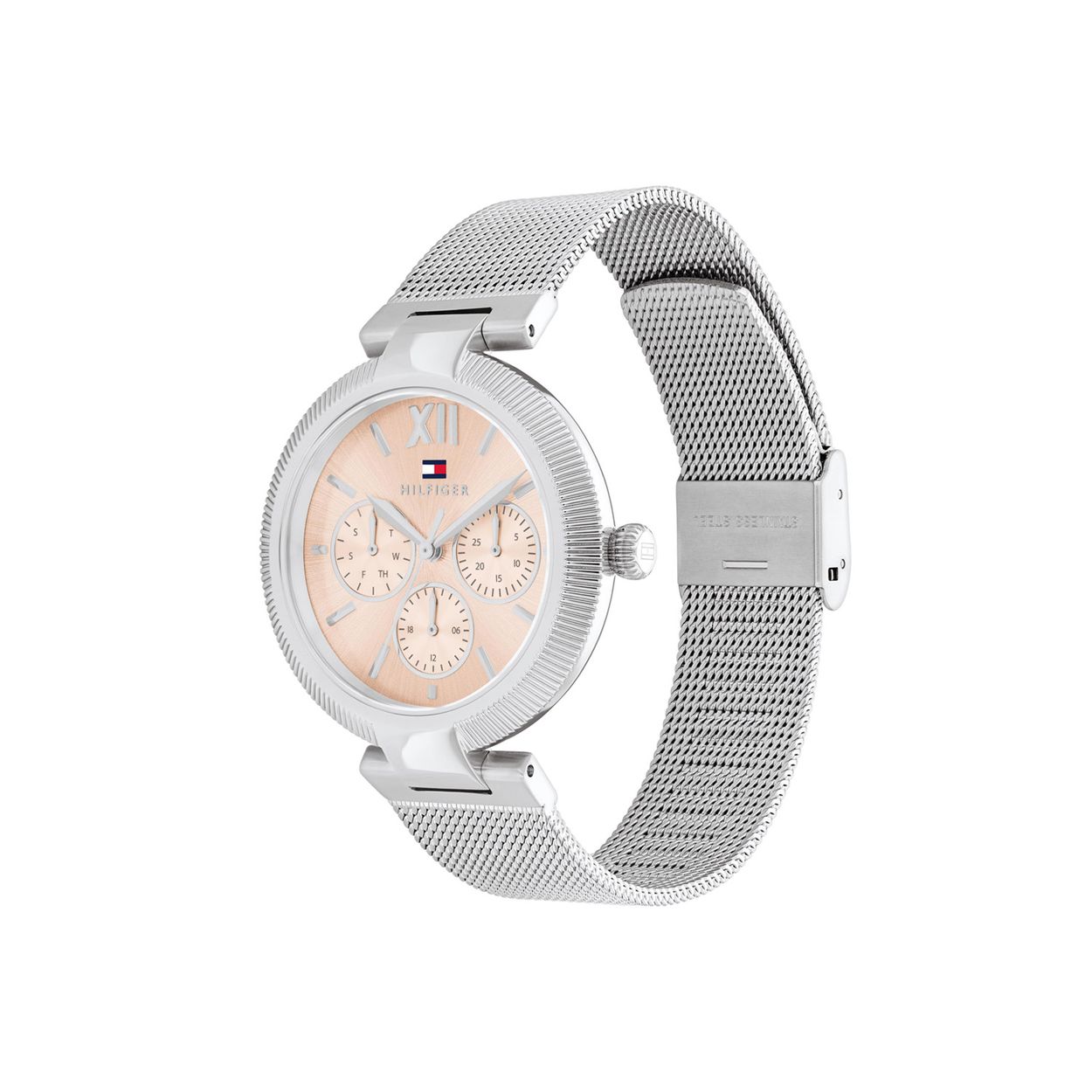 Dit specifieke horloge van Tommy Hilfiger uit de Sophia serie met artikelnr: TH1782693 is een sportief chique dameshorloge die niet in je collectie mag ontbreken. Het stalen dameshorloge heeft een ronde zilverkleurige kast met een gekartelde bezel en een roze sunray wijzerplaat met een dag,- datum en 24-uursaanduiding. Met een speciale aanzet de kast zit een fijne zilverkleurige milanese band. Het horloge heeft een mineraalglas, een doorsnee van 36mm en is 3ATM.