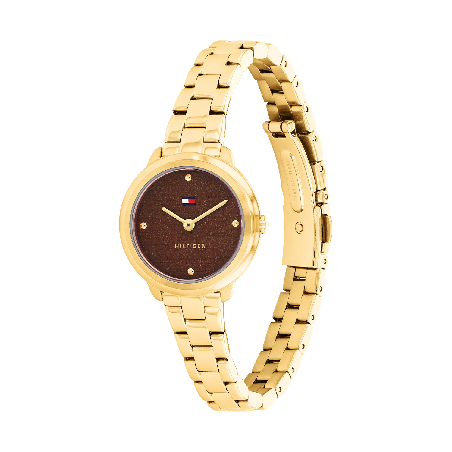 Dit specifieke horloge van Tommy Hilfiger uit de Demi serie met artikelnr: TH1782815 is een casual dameshorloge die niet in je collectie mag ontbreken. Het stalen dameshorloge heeft een ronde goudkleurige kast met een glanzende goudkleurige bezel en een bruine geschuurde wijzerplaat met fijne wijzers en het Tommy logo. Aan de kast zit een goudkleurige glanzende schakelband met vouwsluiting. Het horloge heeft een mineraalglas, een afmeting van 26mm en is 3ATM.
