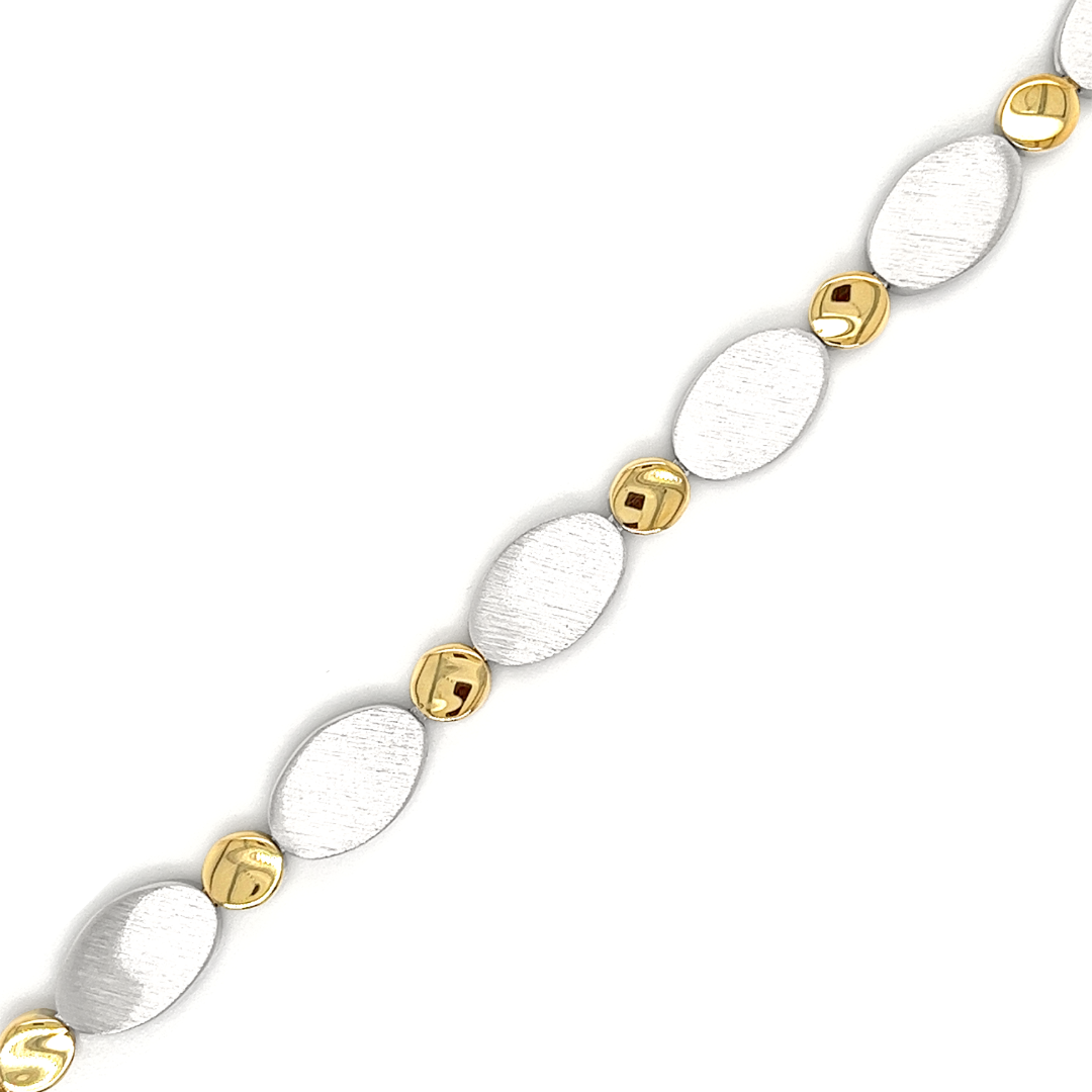Deze armband is gemaakt van 925 zilver. De armband is gedeeltelijk gematteerd en gedeeltelijk glad gepolijst, de combinatie van mat/ glans geeft deze armband een erg mooie uitstraling. De glanzende schakels zijn zilver verguld (goudkleur). Ook heeft de armband een stevig karabijnslot.